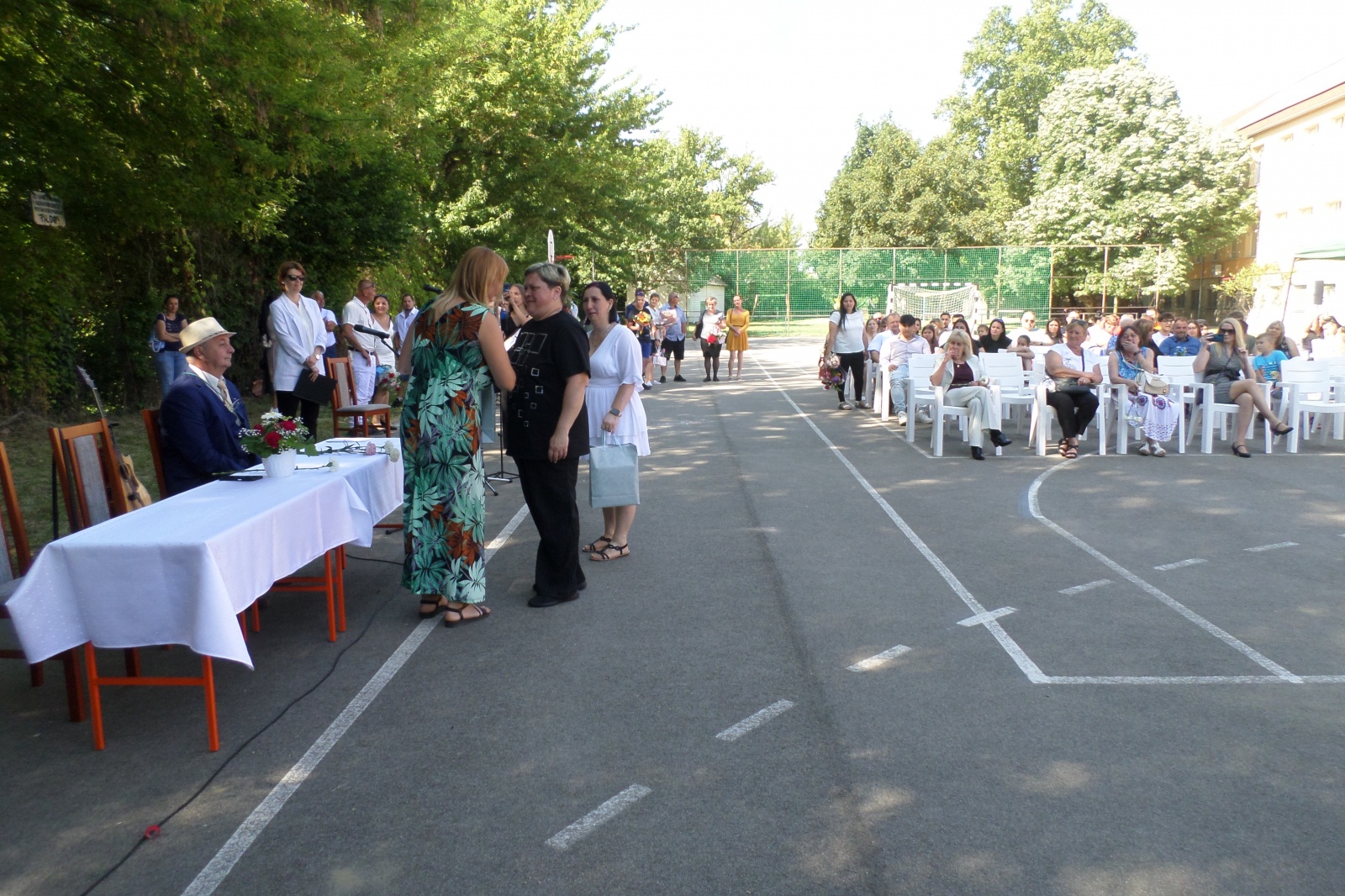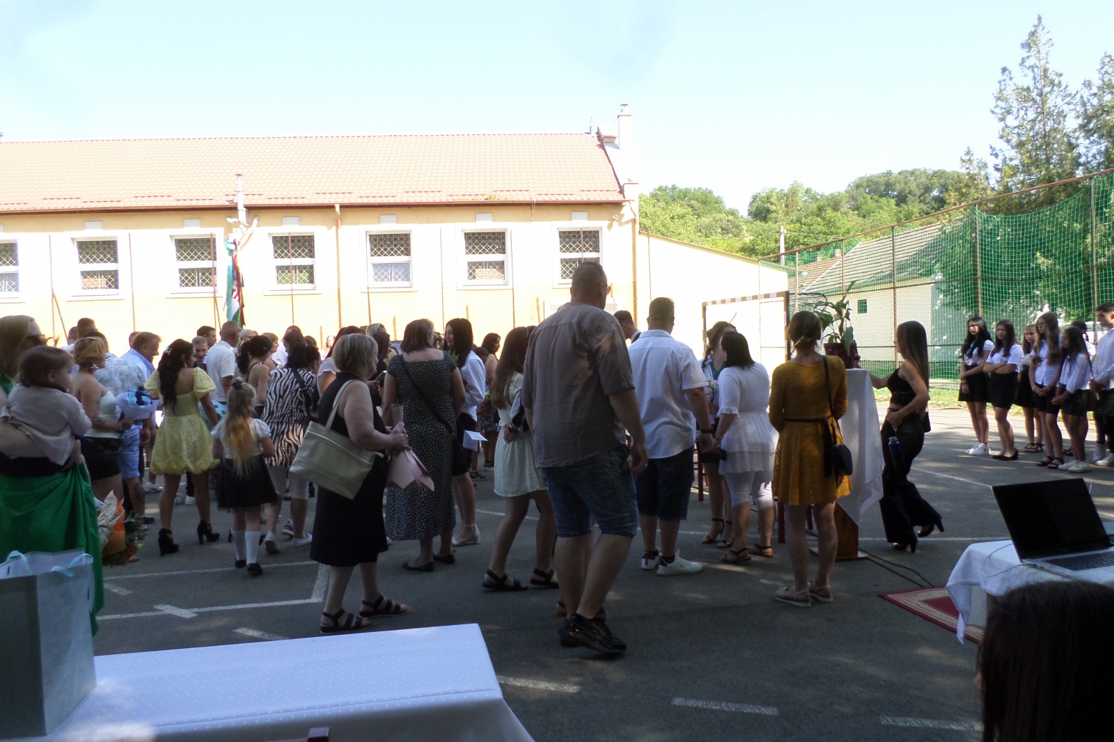 A vendégek átadták a ballagóknak hozott csokrokat, Borza Virág a szülői munkaközösség nevében köszönte meg Busi Melindának és Pintérné Schvarcz Anettnek a nyolc éven át folytatott tevékenységet.