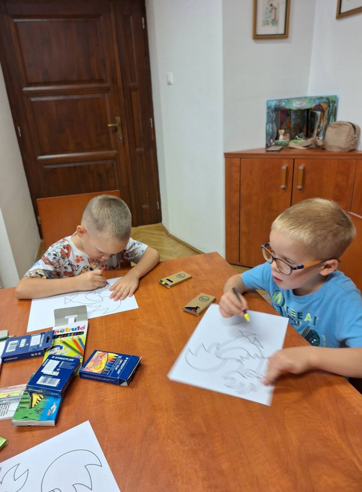 Kiskakast színezni, mosolygós arcokat és macit ragasztani.