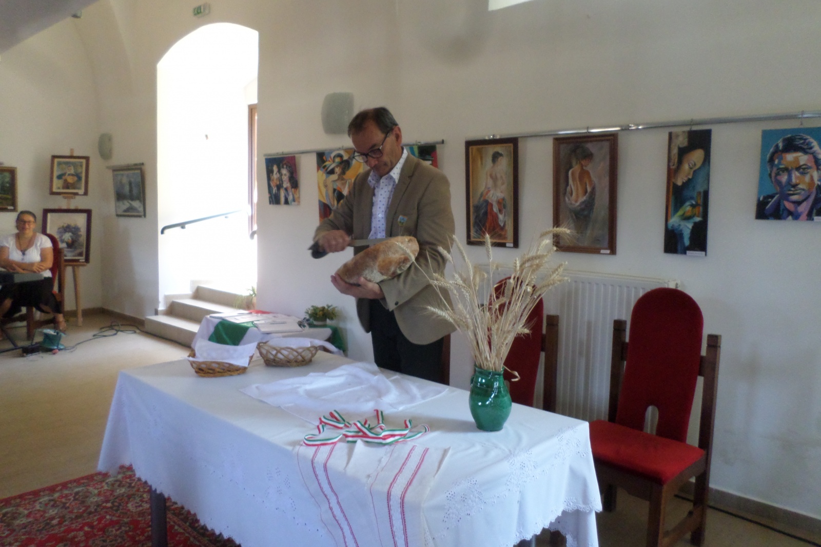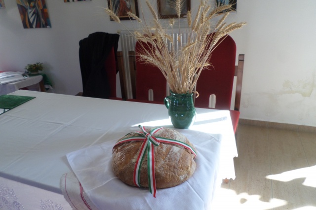 A megszentelt új kenyeret Greifenstein József polgármester szegte meg, majd a beszélgetés során ebből mindenki falatozhatott.