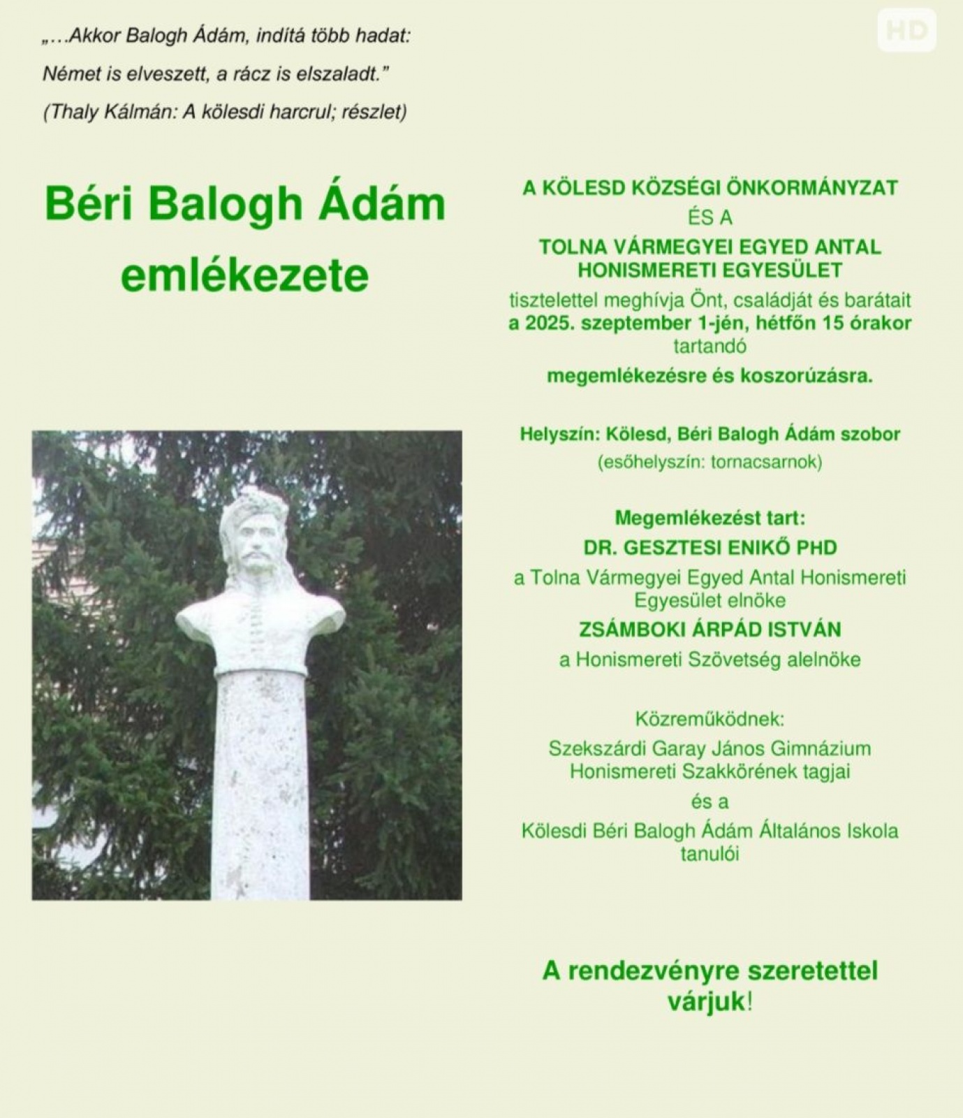 Az évfordulón Dr. Gesztesi Enikő PHD a Tolna Vármegyei Egyed Antal Honismereti Egyesület elnöke és Zsámboki Árpád István a Honismereti Szövetség alelnöke megemlékeztek Béri Balogh Ádámról, és a kölesdi győzelemről.