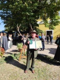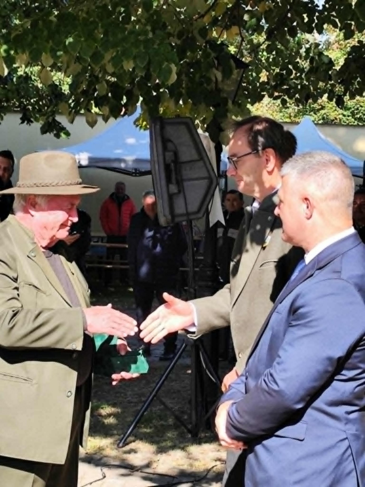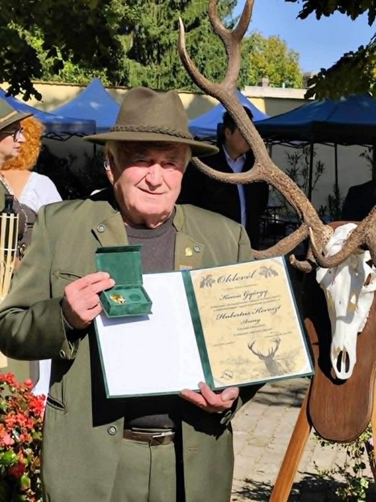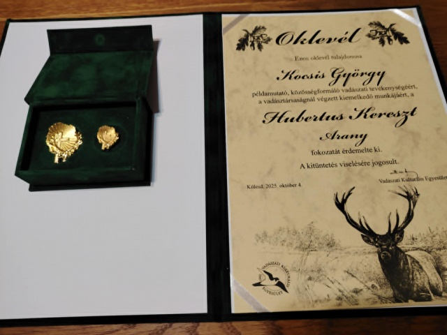 "Az oklevél tulajdonosa Kocsis György példamutató, közösségformáló vadászati tevékenységéért, a vadásztársaságnál végzett kiemelkedő munkájáért, a Hubertus Kereszt Arany fokozatát érdemelte ki.