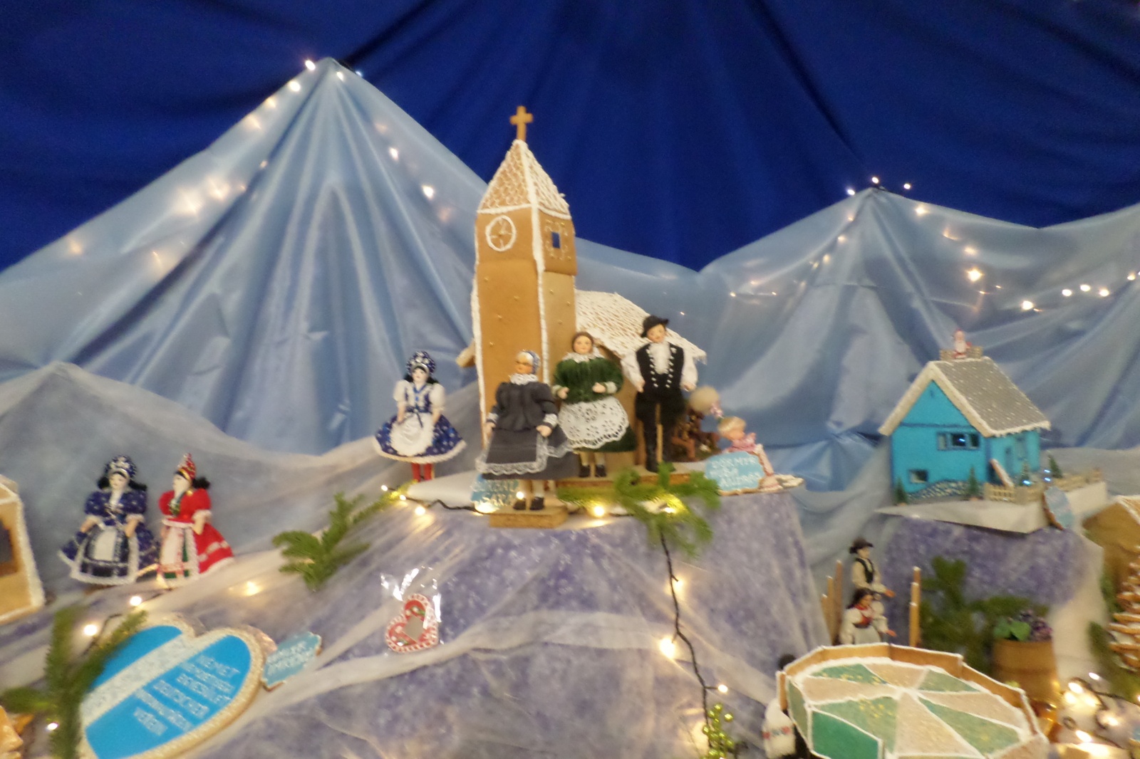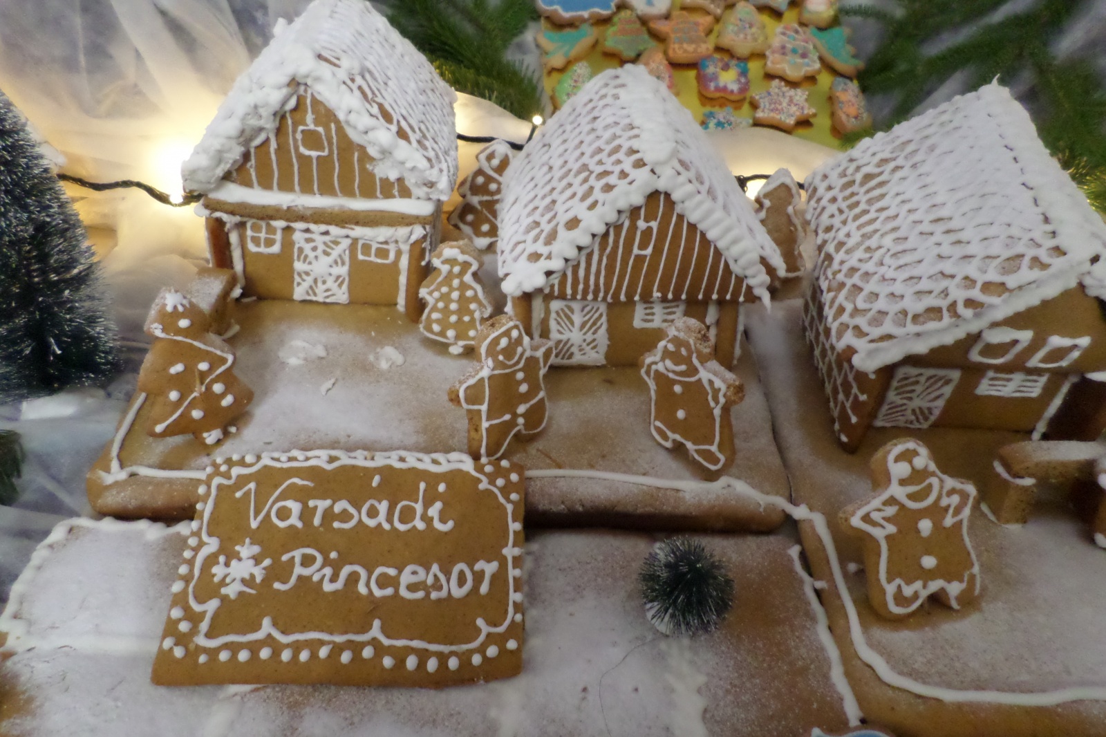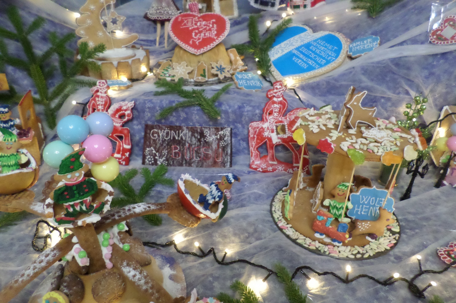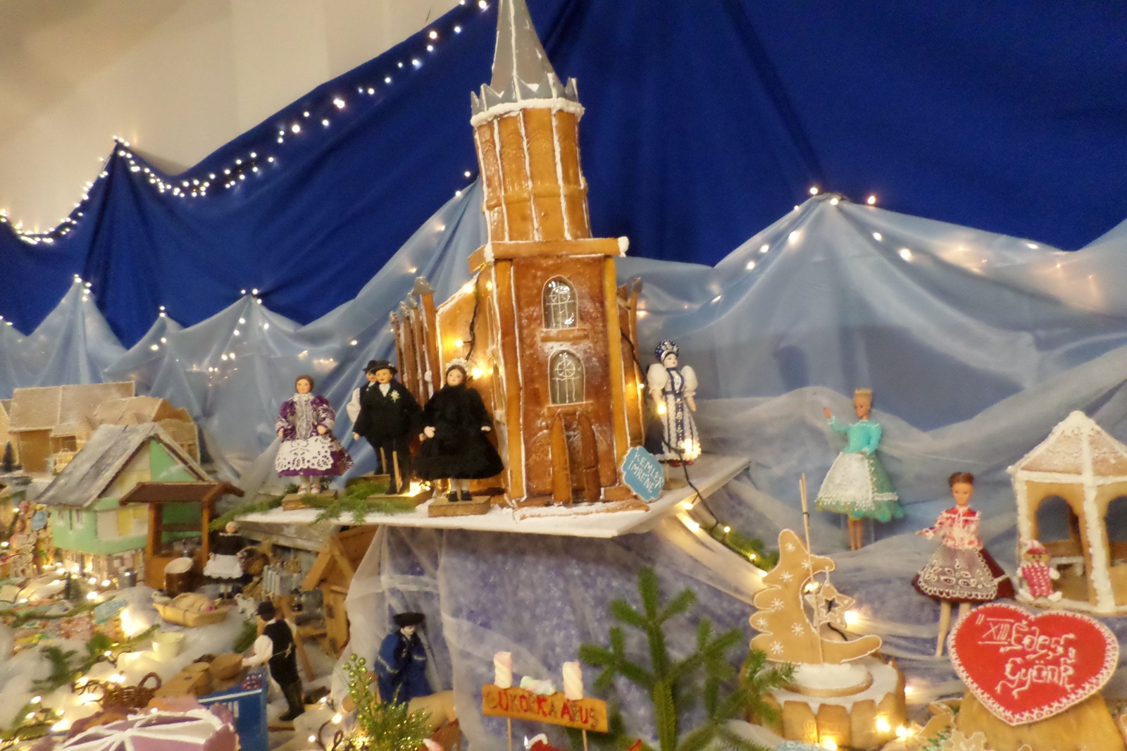 Vezetőnk elmondta, hogy már hetek óta tart a készülődés, az egyesület asszonyai 117 kg tésztából sütöttek mézeslapokat és figurákat, melyekből az épületek készültek, no meg az iskolások-óvodások ismerkedtek a cukros díszítéssel, a gyerekek gyakorolták a mézeskalács készítés hagyományát.