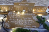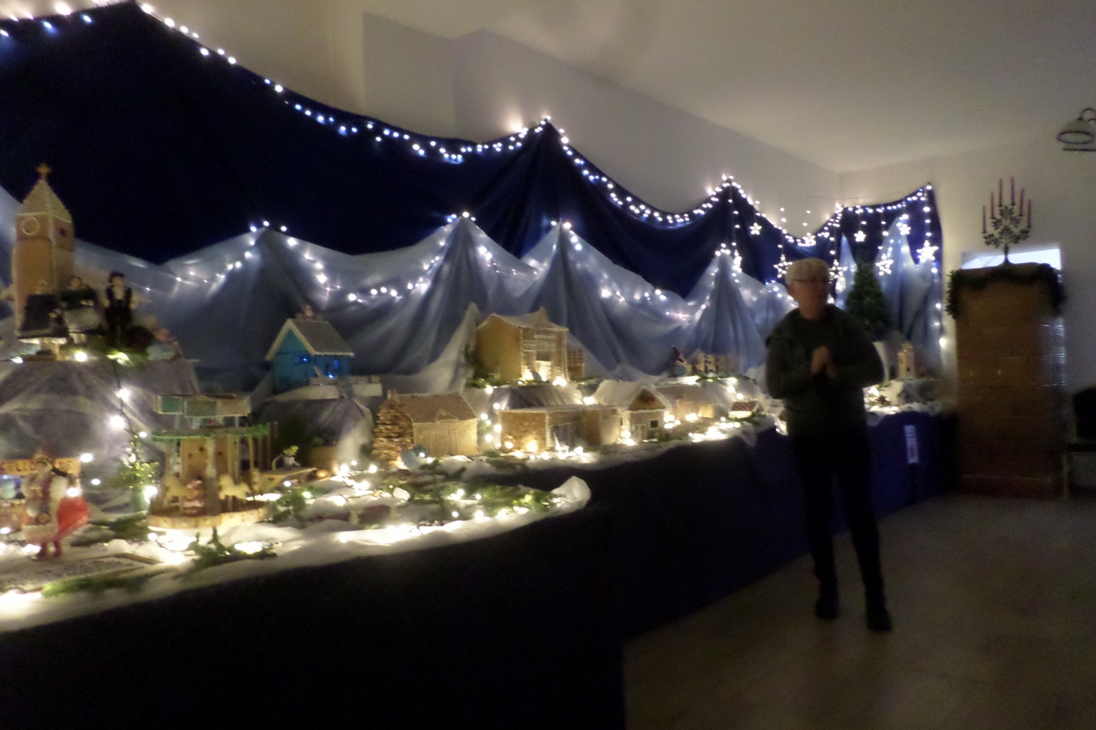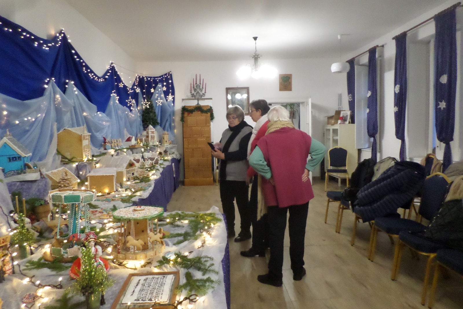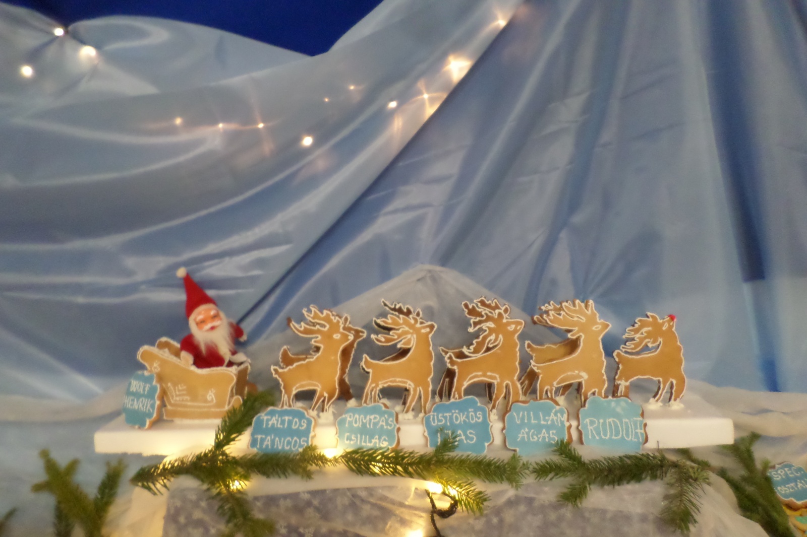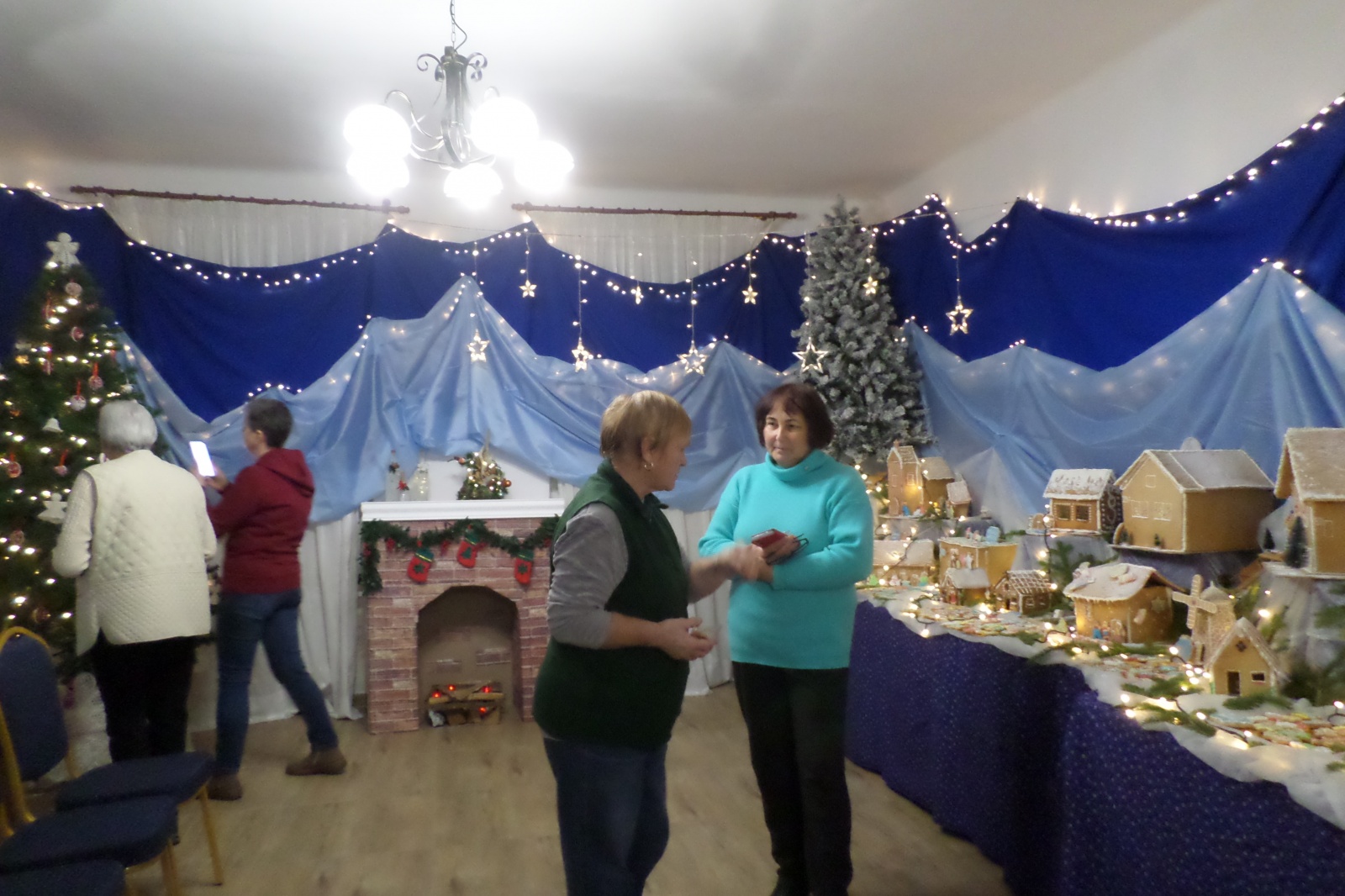 Vezetőnk elmondta, hogy már hetek óta tart a készülődés, az egyesület asszonyai 117 kg tésztából sütöttek mézeslapokat és figurákat, melyekből az épületek készültek, no meg az iskolások-óvodások ismerkedtek a cukros díszítéssel, a gyerekek gyakorolták a mézeskalács készítés hagyományát.