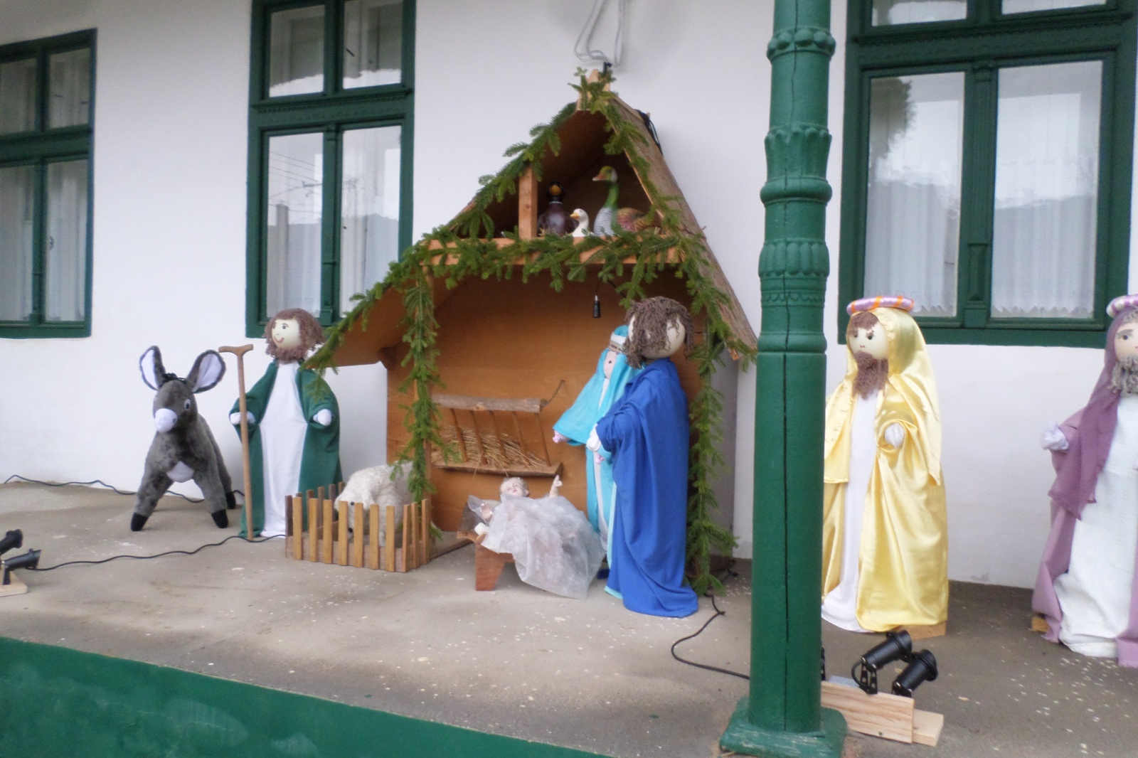 Az épület gangján házilag készült betlehemi figurák, (József, Mária, a kisded Jézus, a háromkirályok és még egy teve is) köszöntött bennünket.